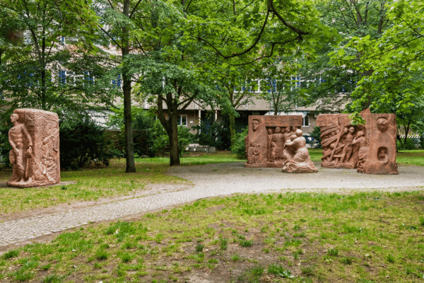 Stand among reddish stone figures calling out for their husbands. This memorial marks where wives protested for days, facing armed guards, and won—a rare victory against Nazi terror.