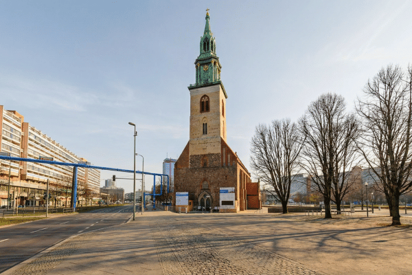 Pause beside medieval Berlin's oldest church, where red bricks trace lost houses and centuries of persecution echo. The TV Tower above reminds you how layers of history stack here.