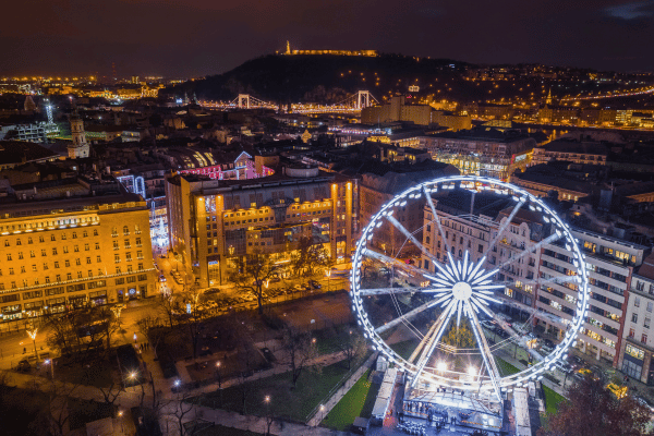 A glowing Ferris wheel turning above Erzsébet Square, offering magical Christmas views of the whole city.