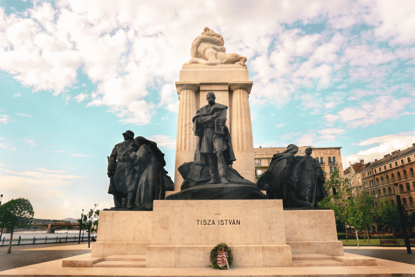 A dramatic bronze memorial surrounded by figures of Hungarian society, set against a softly lit festive square.
