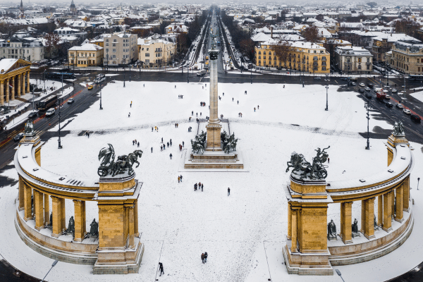 A monumental plaza of statues, chariots, and sweeping colonnades, glowing softly at Christmas and celebrating Hungary’s epic history.