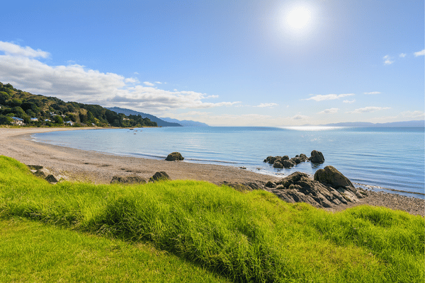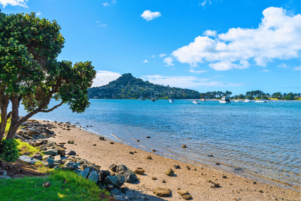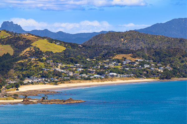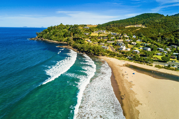 Five-kilometer golden crescent named after HMS Buffalo wreck. Perfect for swimming, fishing, paddleboarding. Gateway to Whitianga's marina and America's Cup heritage.