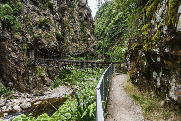 Iconic flat cycling route from Waikino through Karangahake Gorge. Vintage Goldfields Railway, 1100m tunnel, swing bridges, gold-mining relics. Families love this easy adventure.