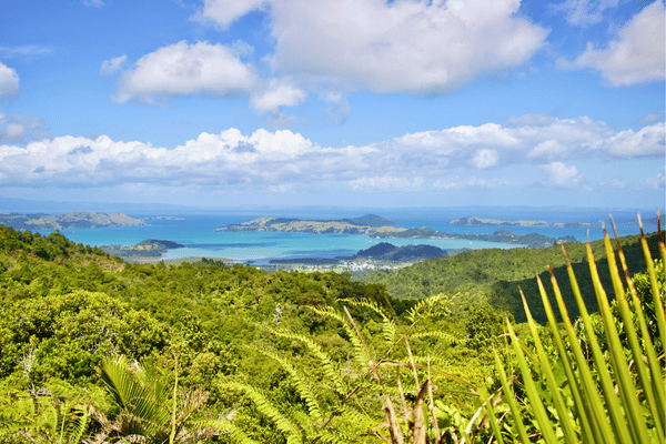 Moderately challenging ridge walk through native bush to panoramic summit views over Coromandel Peninsula, coastline, and Hauraki Gulf. Historic mining shafts en route.