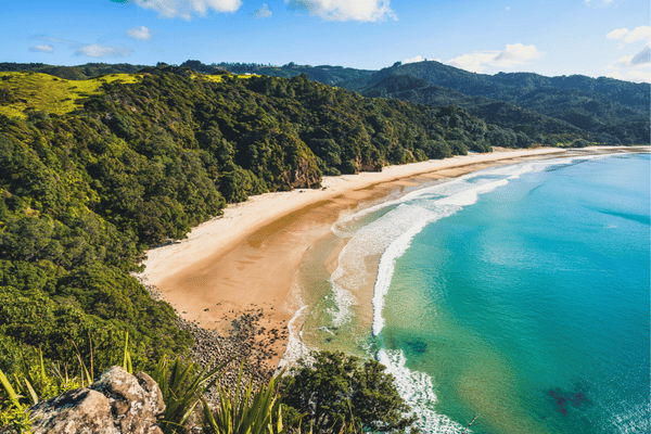 Golden Whangapoua Beach leads via tide crossing and bush track to pristine New Chums Beach—untouched white sand, turquoise water, pohutukawa shade. Pure paradise.