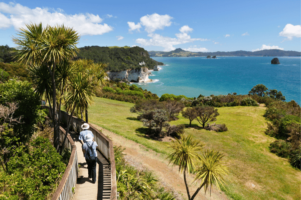 Gravel road climbs through pohutukawa-scattered hills to Cathedral Cove carpark. Trail begins here—45-minute walk to iconic natural archway through native bush.