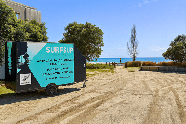 Four-kilometer golden ribbon perfect for surfing, swimming, paddleboarding. Whenuakura (Donut Island) kayak tours, Clarke Island snorkeling, legendary Repco Beach Hop festival venue.