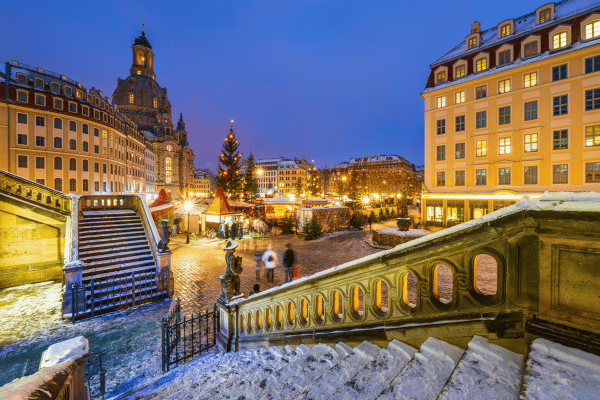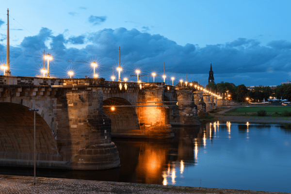 Cross almost a thousand years of history on this beautiful bridge, where breathtaking views of Dresden's glowing towers, domes, and the shimmering Elbe create the perfect holiday postcard moment.