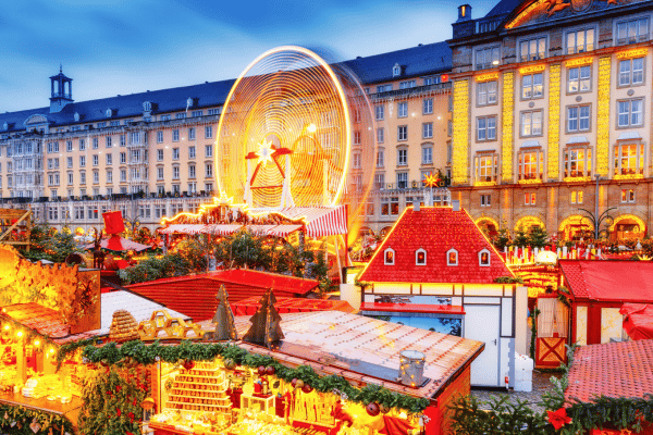 Meet the Golden Rider gleaming in holiday splendor, spin on the glowing Ferris wheel, and soak up the festive energy of this beautiful square where Christmas comes alive all around you.