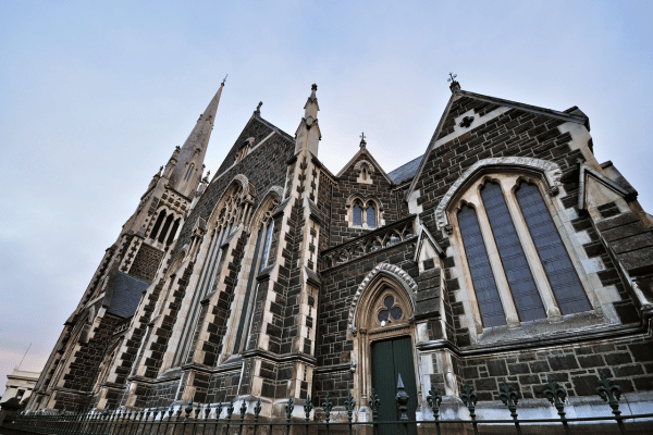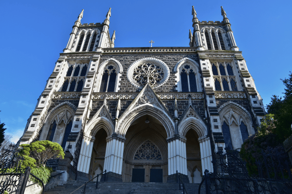 Twin spires of bluestone and limestone, Munich stained glass and a soaring Gothic interior — stunning from any angle.