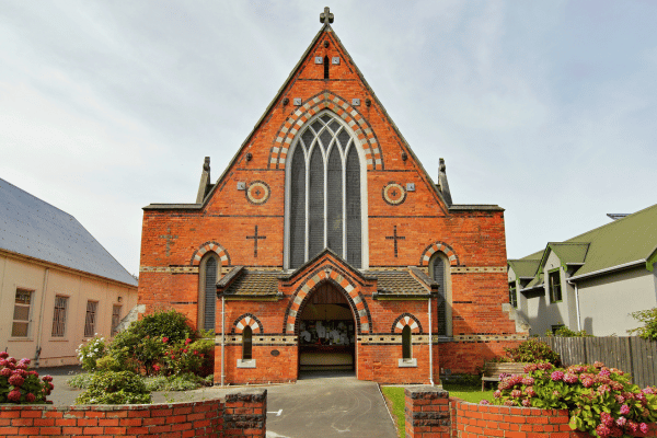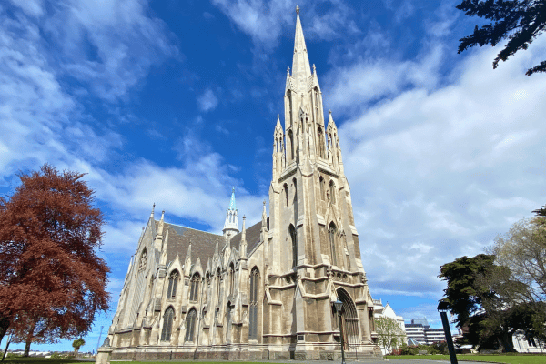 Grey Oamaru stone, tall spire and superb acoustics — a Gothic gem often used for concerts and quiet reflection.