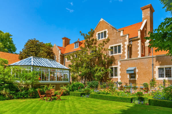 Red-brick Gothic charm with patterned brickwork and serene garden — a Victorian-era slice of peace.