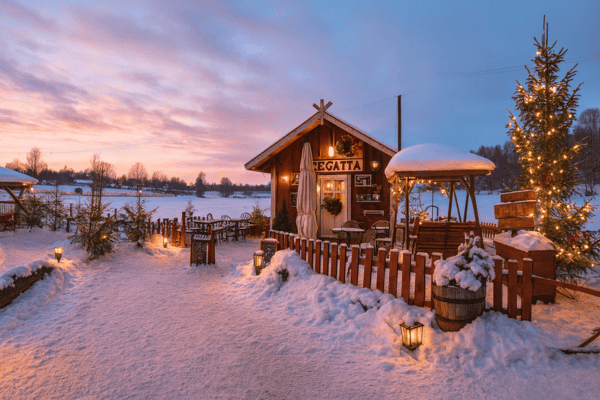A tiny red seaside cottage glowing with Christmas charm. Cinnamon buns, crackling grills, icy sea views — the perfect cozy start to your magical Helsinki walk.