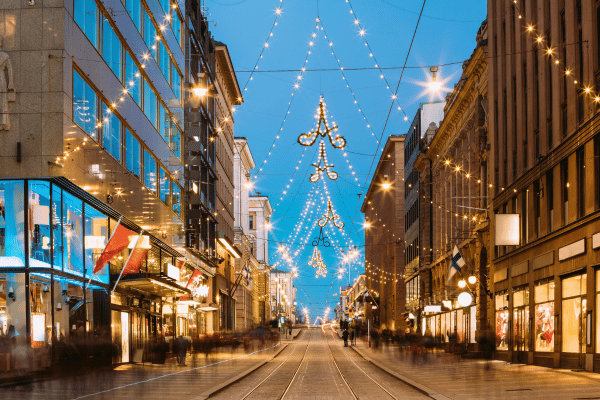 Helsinki’s Official Christmas Street — glowing arches, twinkling canopies, bustling shops, and pure December magic everywhere you look.