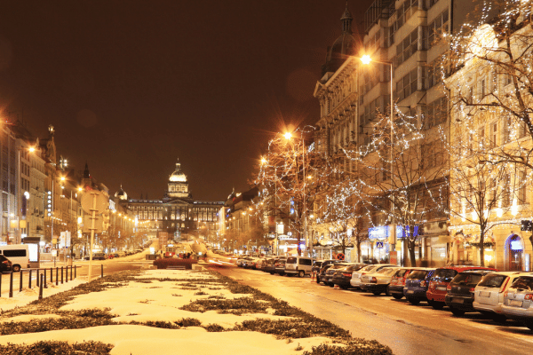 A long glowing boulevard of Christmas cheer—markets, lights, snacks, music, and the National Museum shining like a winter palace. It’s Prague’s festive runway.