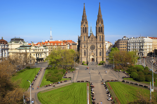 Pure Christmas serenity—glowing stalls, warm lights, local choirs, and the twin towers of St. Ludmila rising like festive candles. A cosy, magical December dream.